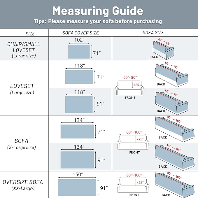 - Product Size: We offer a variety of sizes for you to choose from,Medium Size (71"x102") for loveseat sofa futon chair,Large Size (71"x118", 91"x118") for 2-3 seats,X-Large Size (71"x134", 91"x134") for 3 seats, XX-Large Size (91"x150") for 4 seats, choose the right size according to the actual sofa size. You can choose 71" or 91" according to your needs to achieve different coverage effects!