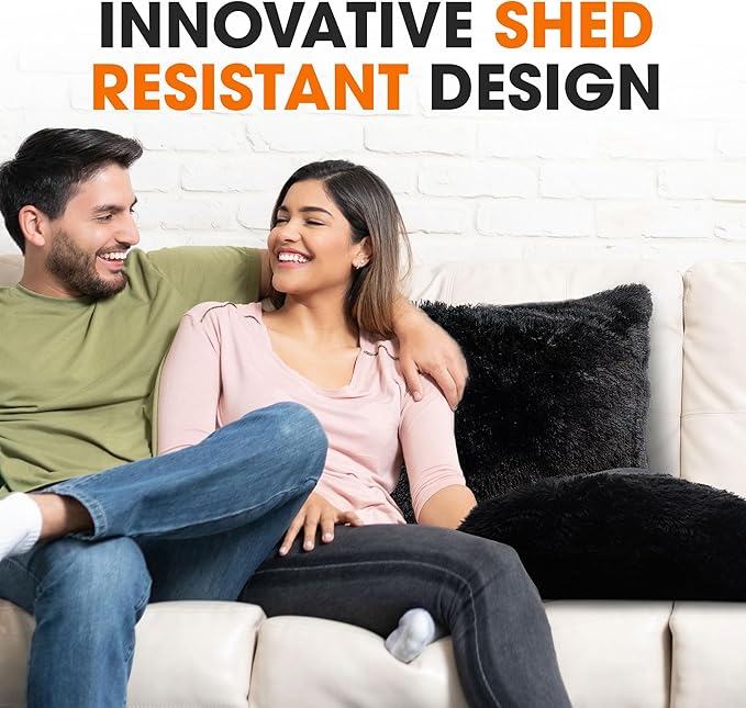 Cheer Collection Throw Pillows for Couch and Bed, Soft Shaggy Throw Pillows with Inserts Included, Cozy Long Hair Faux Fur Pillows - Set of 2-24" x 24" Black
