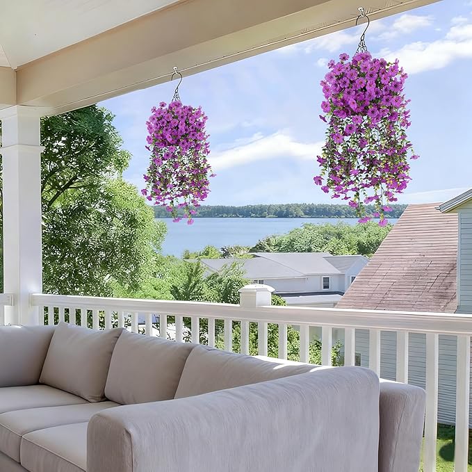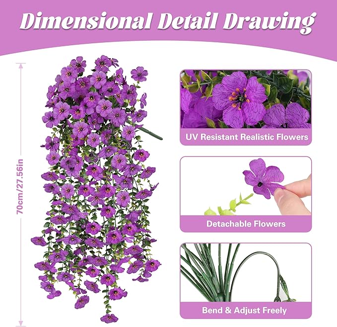 - All-Weather & UV Resistant, Built to Last : Crafted from high-quality silk and durable plastic, These fake hanging flowers stand up to the blazing sun, heavy rain, strong winds, and winter frost without fading or damage. Enjoy vibrant, season-proof color of our faux flowers that stays beautiful all year long